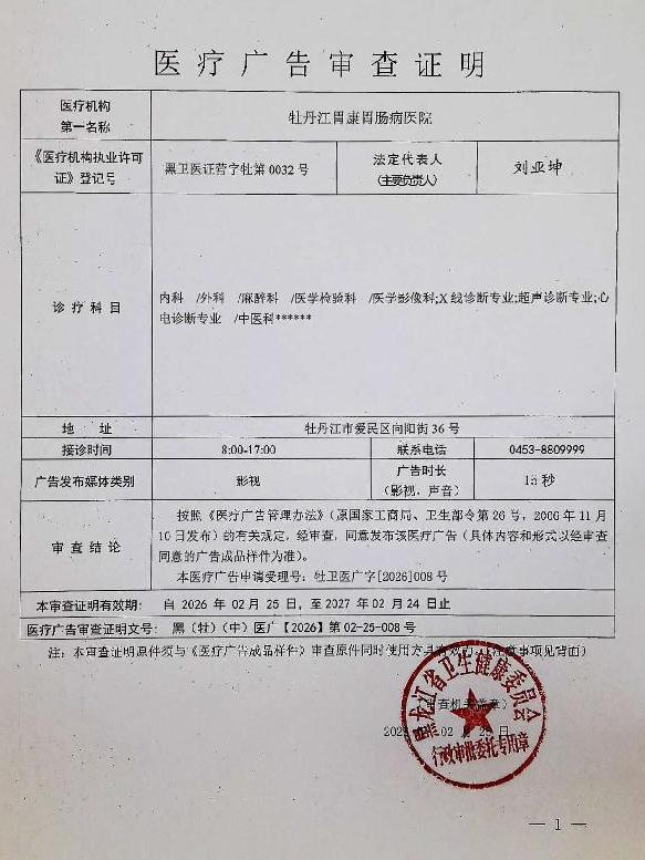• 牡丹江胃康胃肠病医院-医疗广告审查材料(影视、广播、户外、网络)